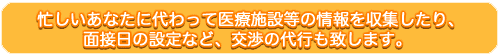 「理想的な職場が見つからない」「就職・転職活動に時間が割けない」など、あなたに代わって当社スタッフが、ご希望に添った情報を収集したり、面接日の設定などの交渉を代行致します。 |